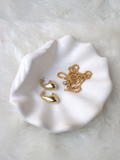 The Big Sea Shell Trinket Dish is a coastal-inspired piece with a detailed shell design, perfect for storing jewelry, coins, or small keepsakes. Its elegant, beachy vibe adds a serene touch to any vanity or tabletop. Jewellery is used solely for photography purposes and is not a part of the product.