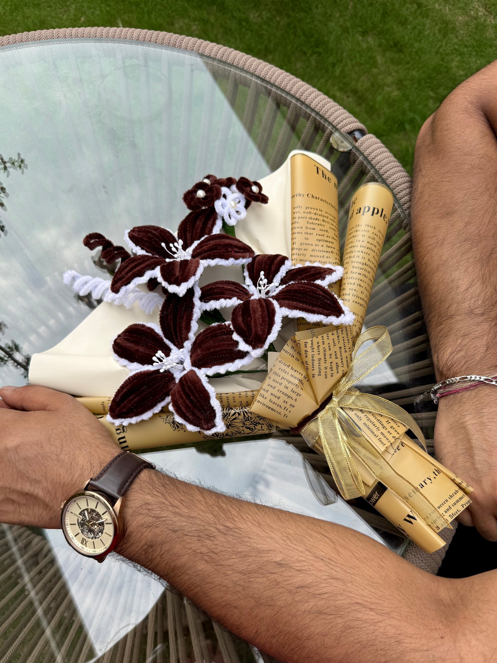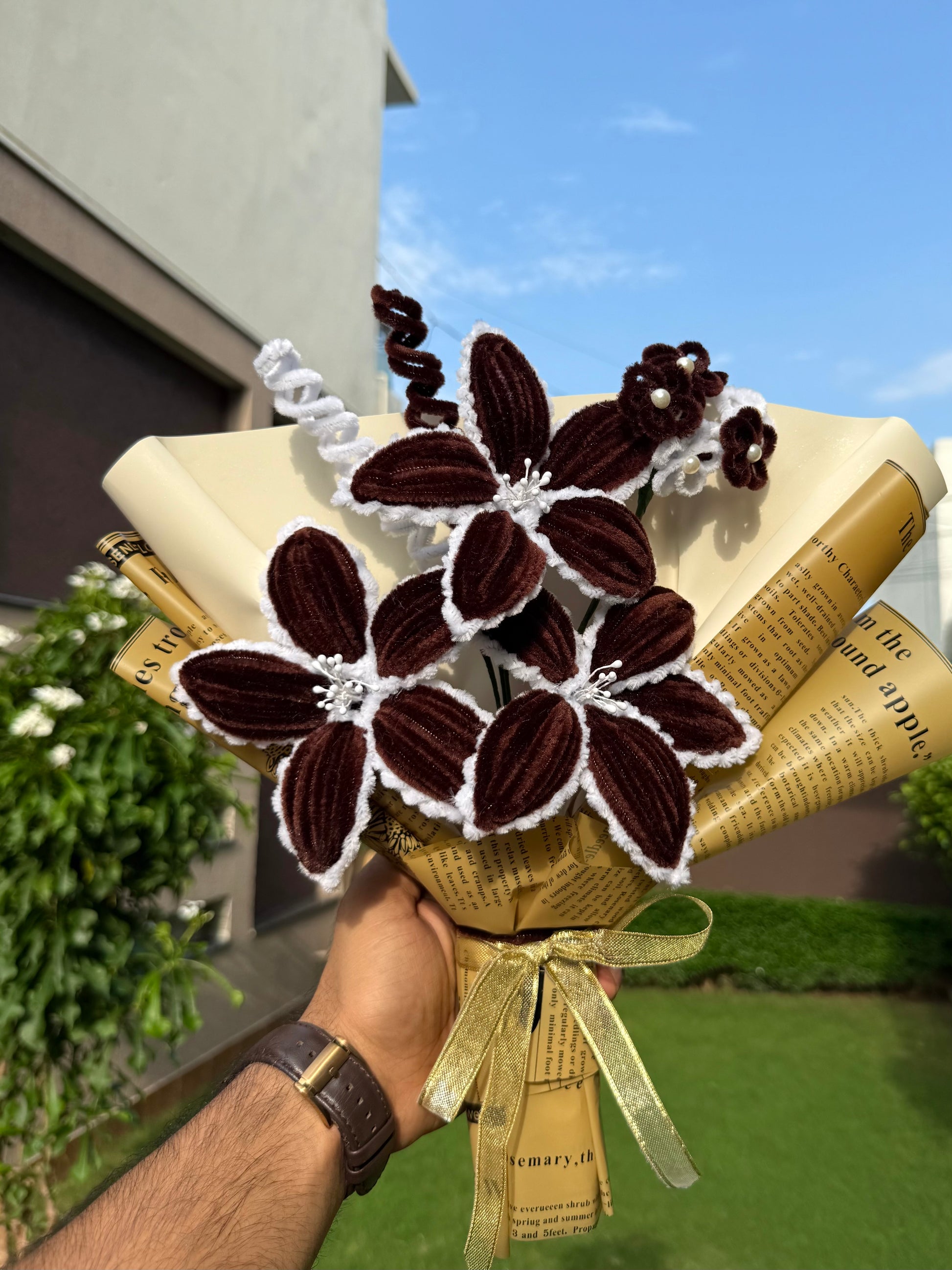 Flowers wilt, but love won't! Our Everlasting Lily Bouquet is a handmade masterpiece as long-lasting as your love. It boasts a gorgeous brown lily bouquet. This flower masterpiece lasts forever. It's ideal for a wedding bouquet, lovely anniversary flowers, or a birthday flower gift. This bouquet offers all the beauty of fresh flowers, without the heartache of wilting petals.