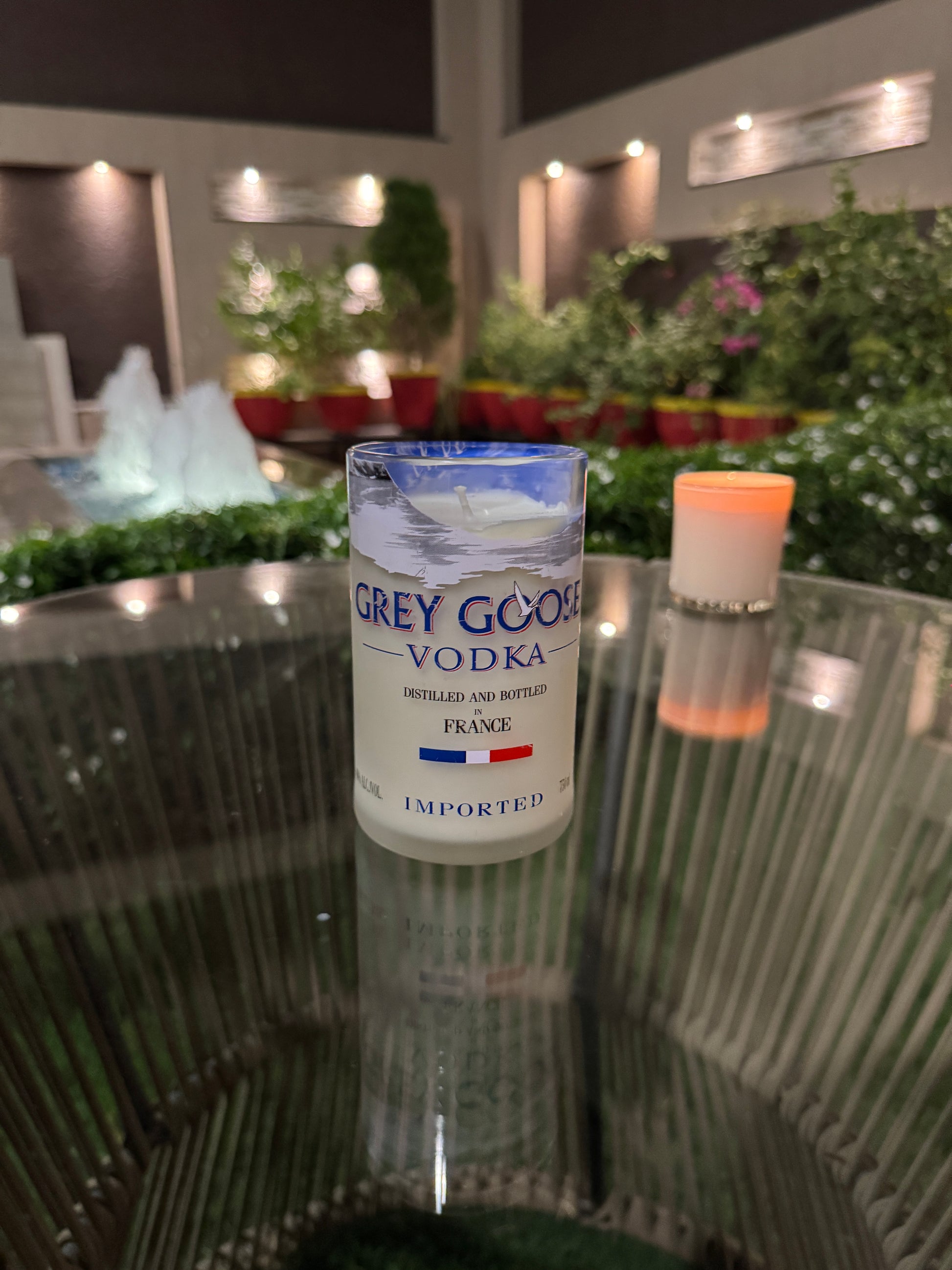 Elevate your ambiance with our Grey Goose Vodka Candle, Oud Edition. Inspired by the elegance and refinement of Grey Goose vodka, this luxury candle is infused with the deep, woody richness of premium oud fragrance. Housed in a repurposed Grey Goose glass, it adds a touch of sophistication to any space.