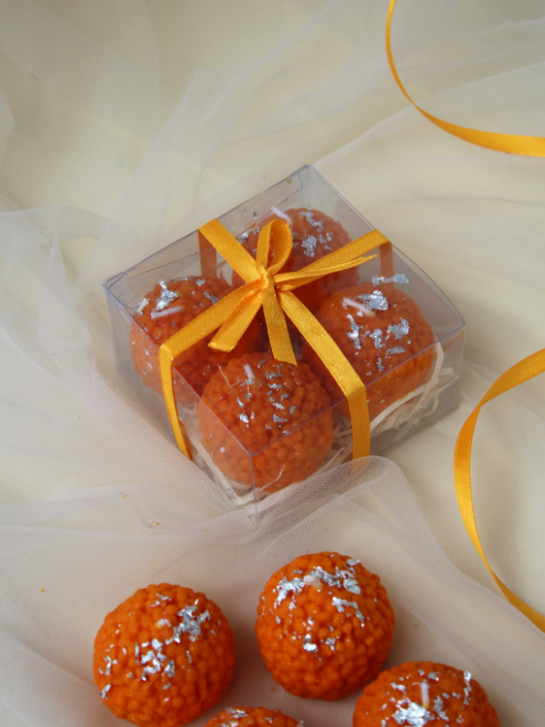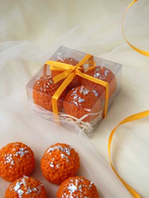 Beautifully packed in a premium transparent gift box with a ribbon, this set of 4 Laddu Candles is perfect for festive gifting and décor. Light up your festivities with these scented laddu candles and experience the magic of tradition in a whole new way!