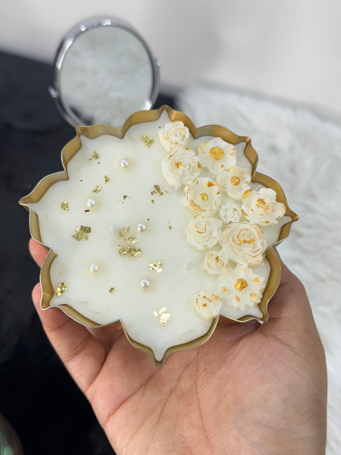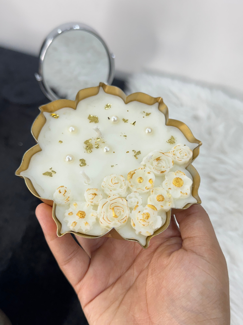 This luxurious Lotus Urli candle set is designed to add a touch of sophistication to any celebration. Crafted in an elegant gold-rimmed flower-shaped base, one candle is adorned with hand-sculpted wax blossoms highlighted with gold detailing, while the other features delicate pearls and real gold foil accents.