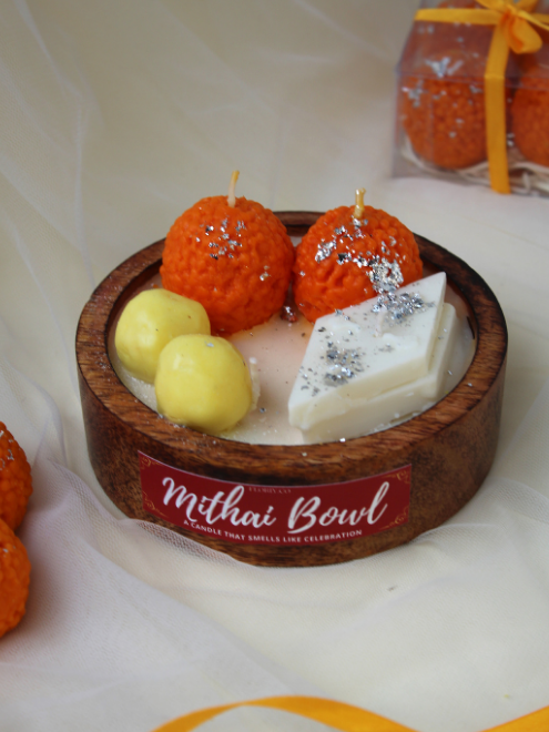 Indulge in the essence of festivity with our Mithai Bowl Candle, a masterpiece that blends tradition with luxury. Handcrafted in a premium wooden bowl, this unique candle is adorned with meticulously detailed Indian sweets: laddu, Kaju katli, and Rasmalai, each designed to resemble real mithai.