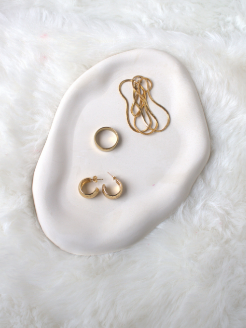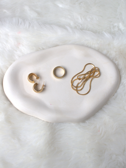 The Oval Cloud Trinket Dish adds a whimsical touch to any space with its cloud-inspired shape. Perfect for holding jewelry, coins, or small treasures, this elegant dish blends functionality with a soft, serene design, making it a lovely accent for any vanity or tabletop. Jewellery is used solely for photography purposes and is not a part of the product.