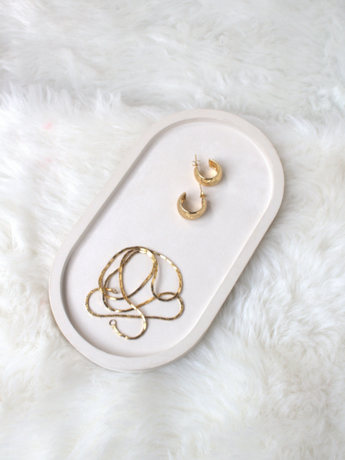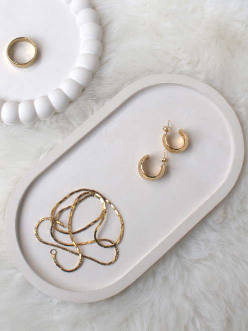Organize your small treasures in style with our Oval Trinket Dish. This elegant, compact tray is perfect for holding jewelry, keys, coins, or other little essentials. Crafted with a sleek, oval design, it adds a sophisticated touch to any vanity, dresser, or entryway. Whether you're looking for a functional accessory or a charming decorative piece, this is a stylish solution that combines practicality with timeless elegance. Keep your space tidy while adding a chic accent to your home. Jewellery is used solely for photography purposes and is not a part of the product.