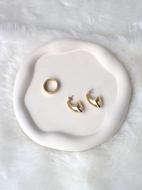 The Round Cloud Trinket Dish is a beautifully designed piece that combines elegance with a playful cloud shape. Ideal for holding small jewelry, coins, or trinkets, this dish adds a touch of serenity and charm to any space. Its simple, clean design makes it a perfect addition to your vanity, desk, or bedside table. Jewellery is used solely for photography purposes and is not a part of the product.