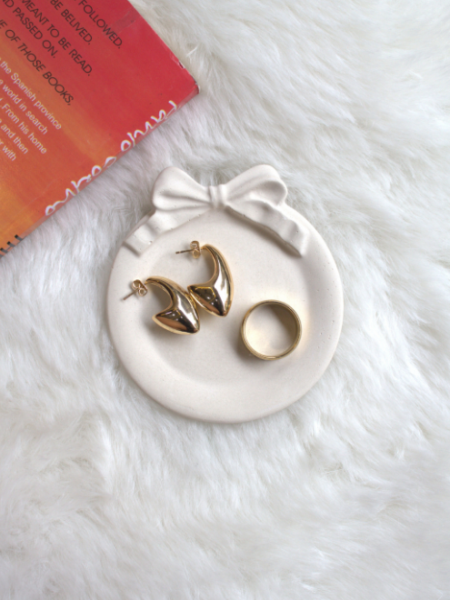 The Bow Trinket Dish is a sweet and elegant piece, designed with a delicate bow shape. Perfect for holding small jewelry, rings, or other keepsakes, this dish adds a charming touch to your vanity or tabletop. Its graceful design makes it a lovely gift or a stylish accent to keep your treasured items organized. Jewelry is used solely for photography purposes and is not a part of the product.